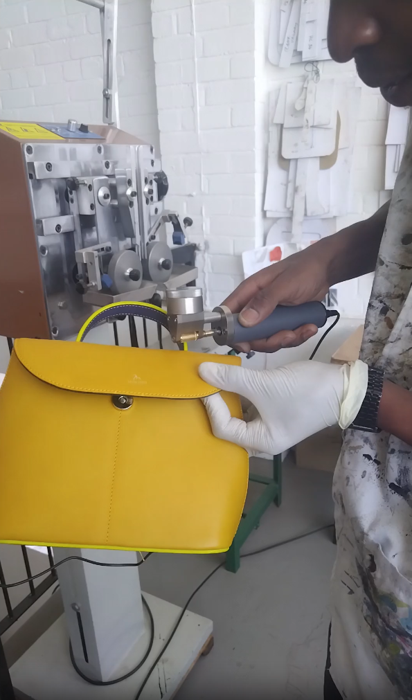 Handmade leather bag with final touches to the handle.